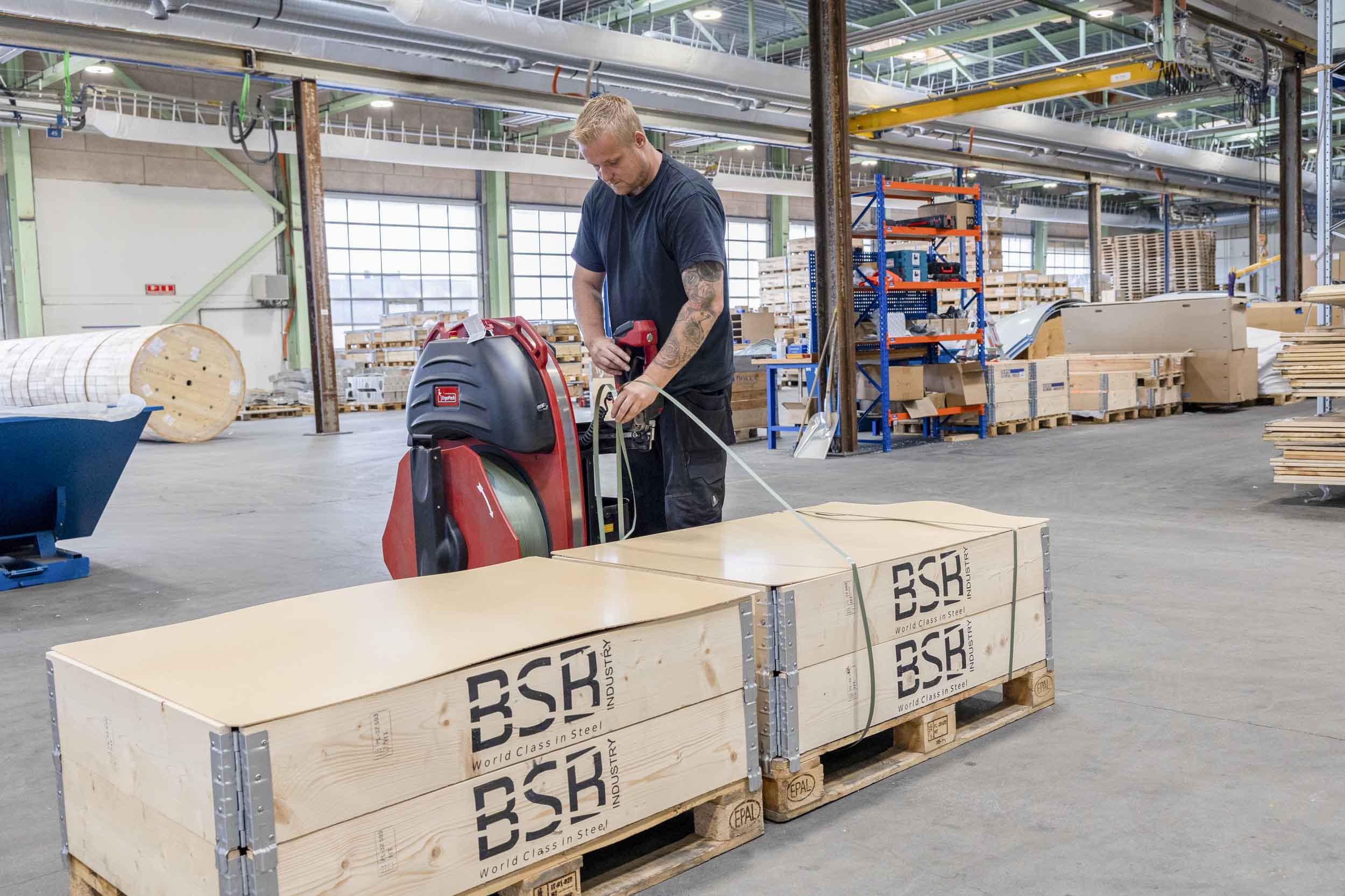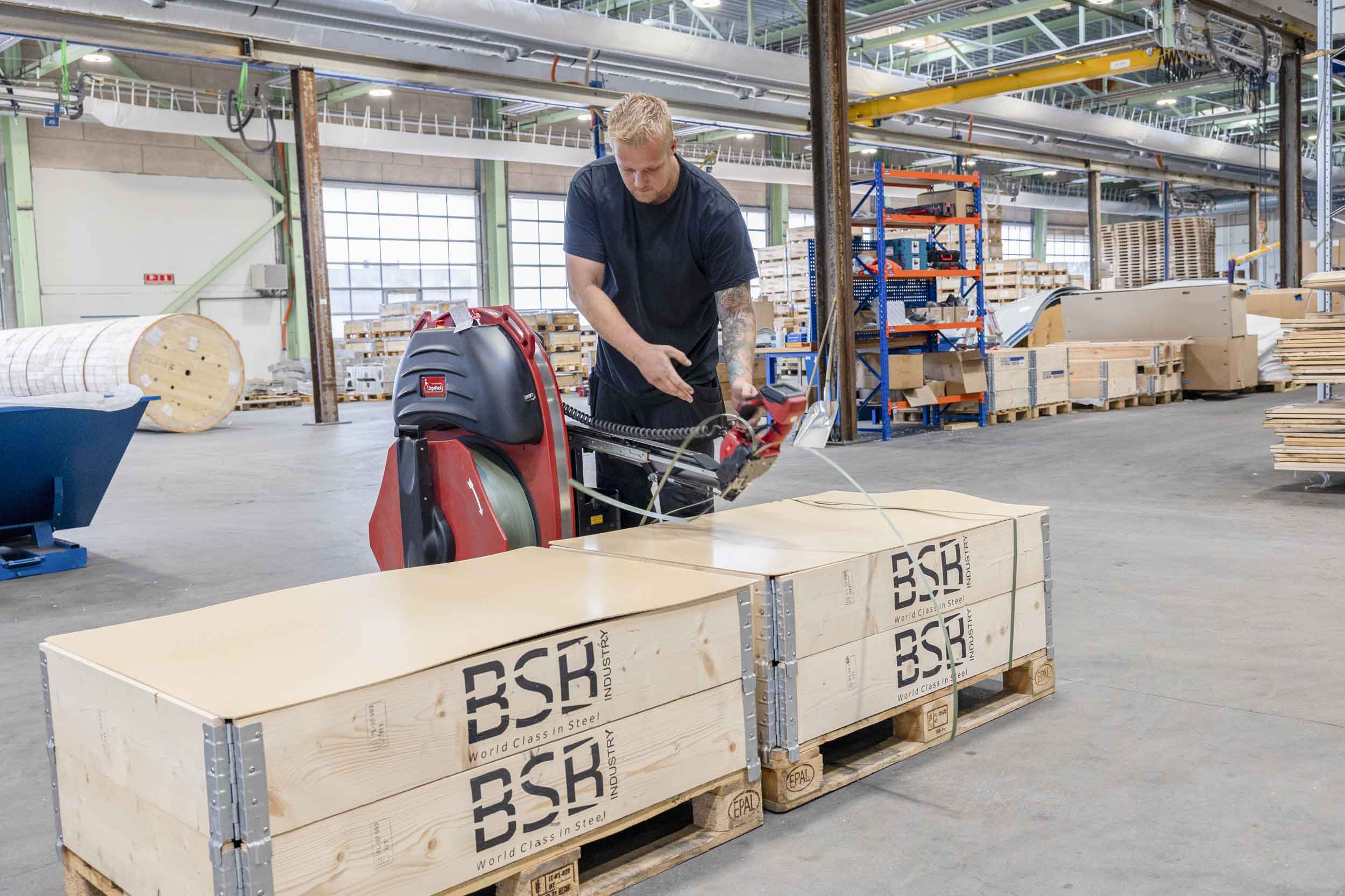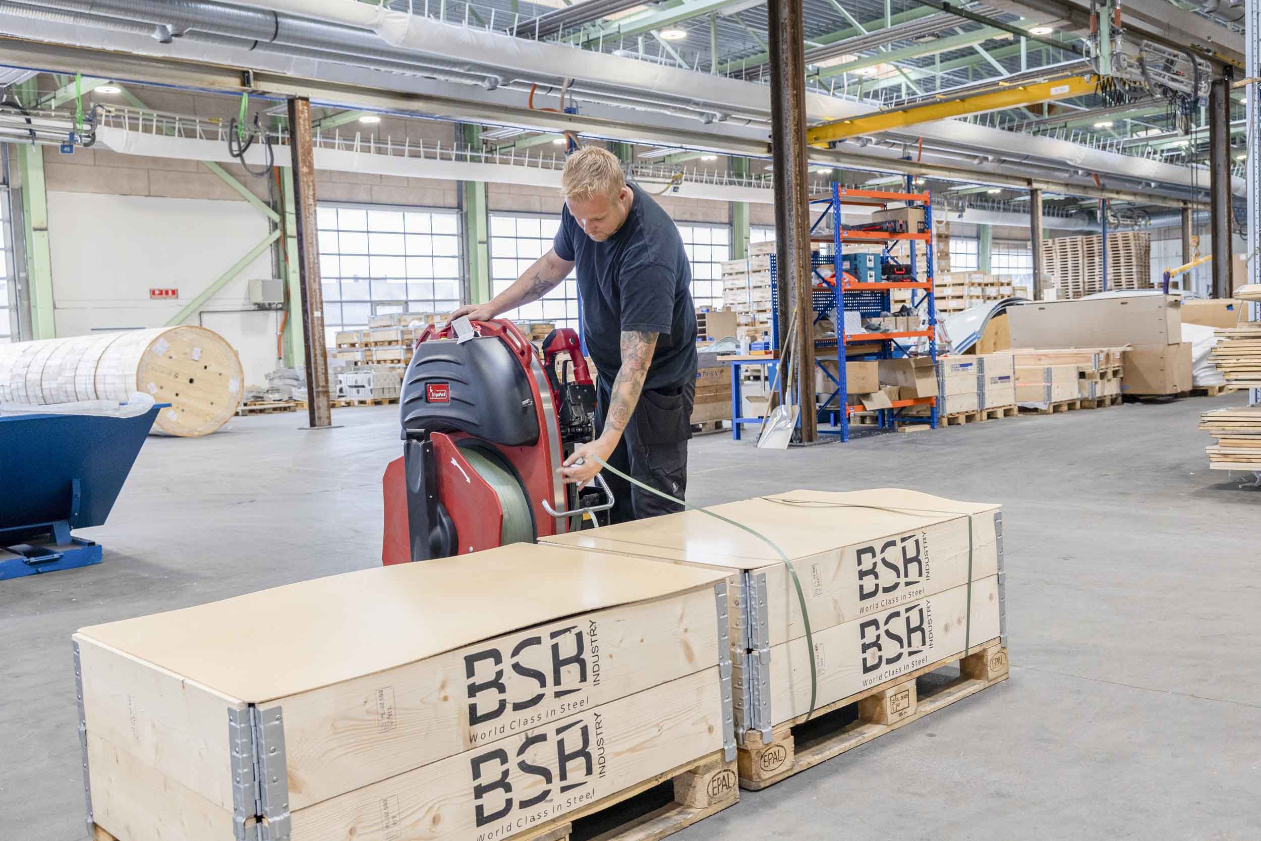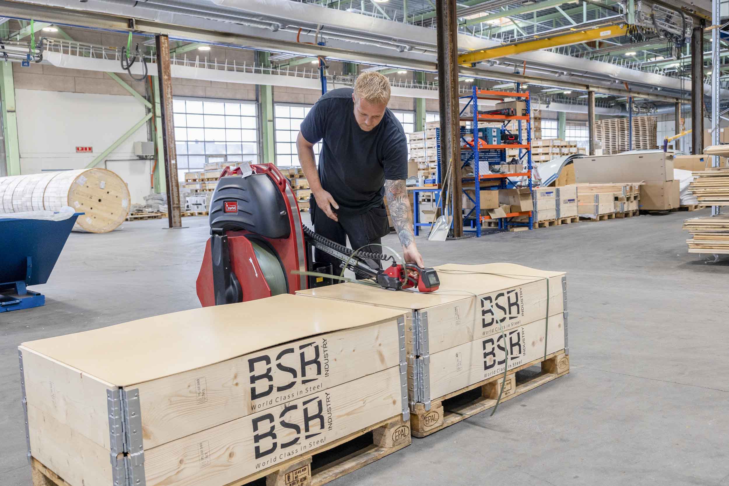 - Tidligere brugte vi en manuel båndmaskine. Den krævede, at vi kravlede rundt nede på gulvet for at få båndet rundt om pallen. Der skal to bånd om hver palle, og det betyder, at vi med den nye maskine allerede har fjernet 6000 manuelle, gentagende arbejdsgange med dårlige arbejdsstillinger, der ofte resulterede i smerter i knæ og ryg. Det er godt for arbejdsmiljøet, fortæller Rafael Kropp Wojtczak.